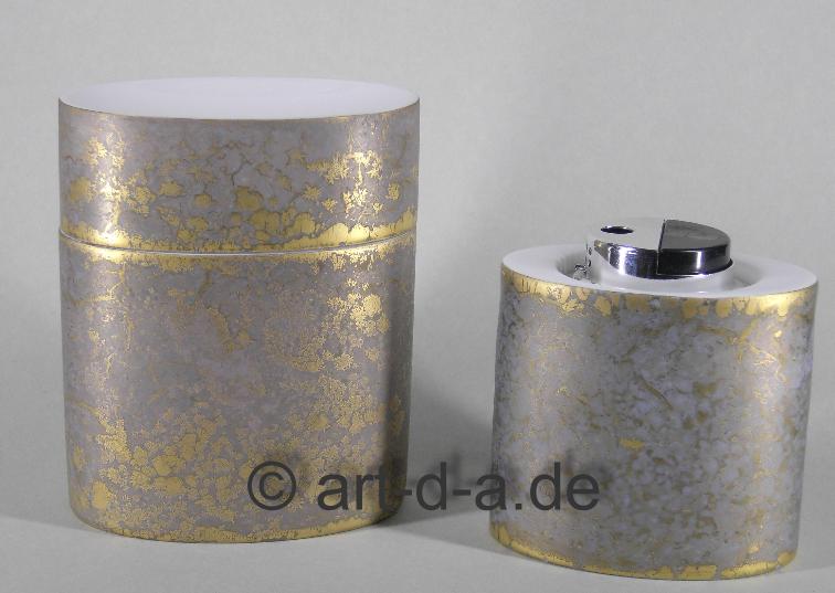 Rosenthal Raucherset 2-tlg. Dekor Goldfeuer handgemalt Dekorentwurf Helmut Drexler signiert Höhe Dose ca. 12 cm Höhe Feuerzeug ges. 10 cm